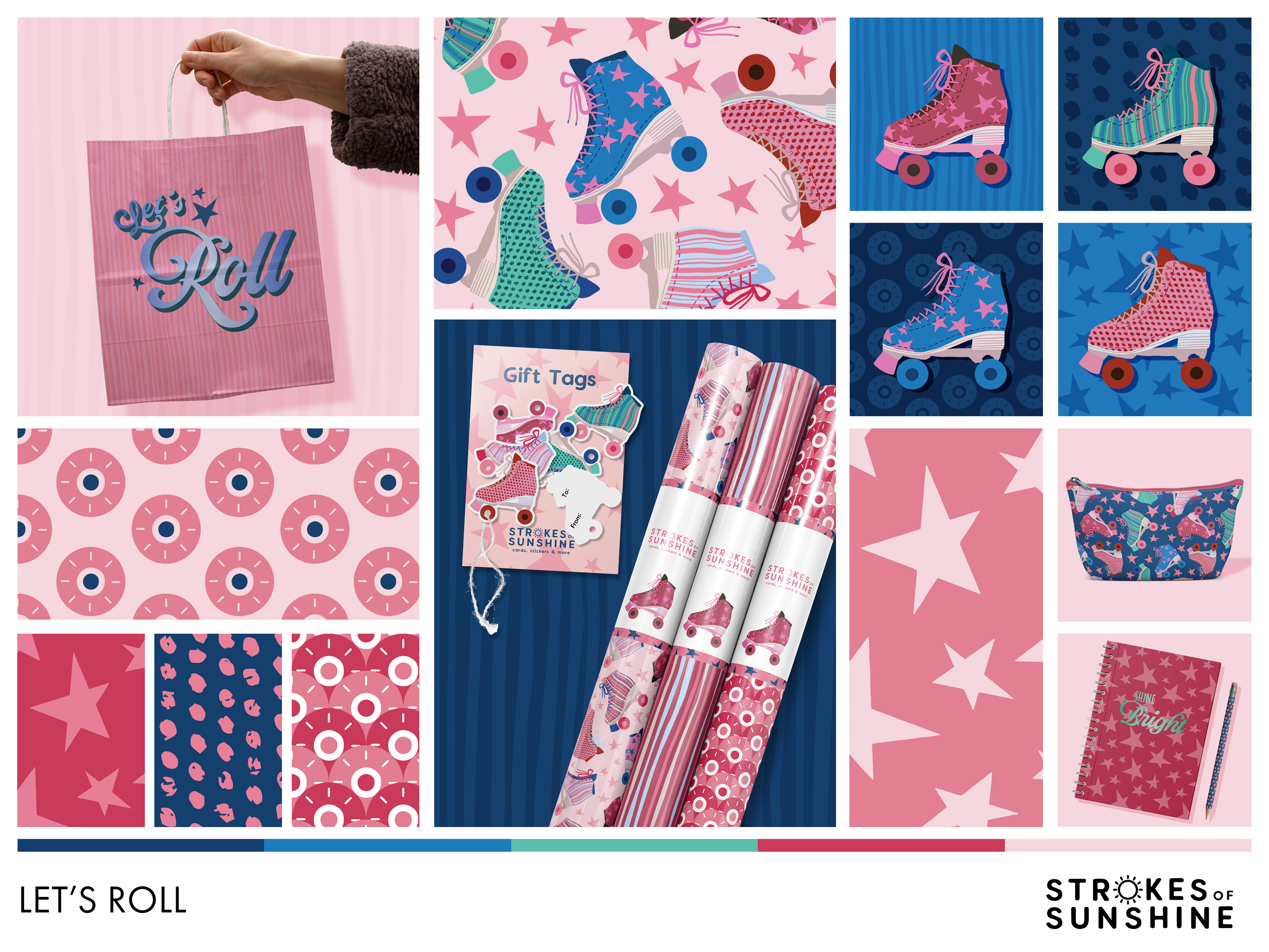 Let’s Roll is a vibrant and playful collection influenced by the retro charm of roller skating. Featuring digitally illustrated roller skates in a bold color pattern, these designs create a girly pop feel that’s ready to tackle any medium. The colorful coordinating patterns provide variety while also standing out by themselves making them perfect for fabric, stationery and a variety of other products. Let’s Roll showcases a love of movement, nostalgia and whimsy while still keeping a modern spin.
